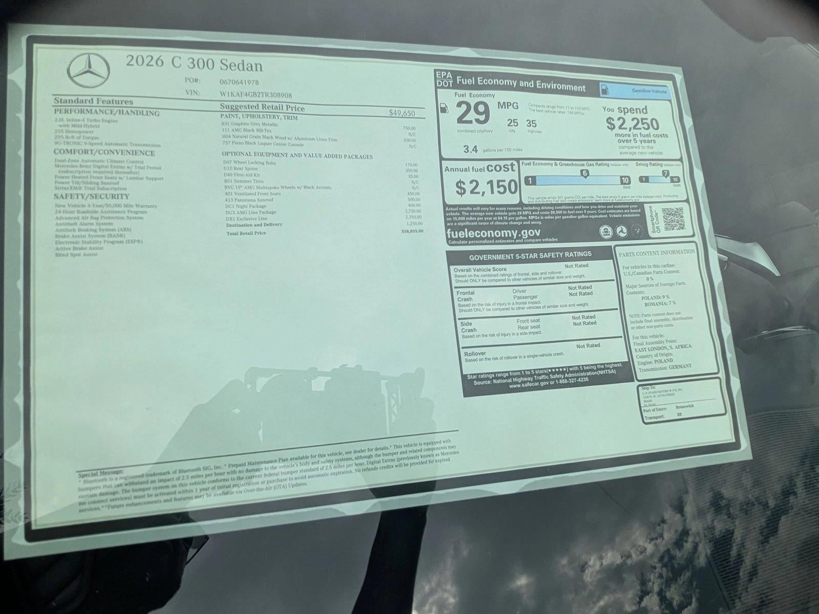 Contact Mercedes-Benz of Miami today for information on dozens of vehicles like this 2026 Mercedes-Benz C-Class C 300. This Mercedes-Benz includes: WHEELS: 19" AMG MULTISPOKE W/BLACK ACCENTS Tires - Front Performance Aluminum Wheels Tires - Rear Performance AMG LINE NIGHT PACKAGE GRAPHITE GREY METALLIC WHEEL LOCKING BOLTS (PIO) Wheel Locks PANORAMA SUNROOF Panoramic Roof Generic Sun/Moonroof Sun/Moonroof Dual Moonroof NATURAL GRAIN BLACK WOOD W/ALUMINUM LINES TRIM Woodgrain Interior Trim BLACK FABRIC HEADLINER VENTILATED FRONT SEATS Cooled Front Seat(s) Heated Front Seat(s) EXCLUSIVE TRIM PACKAGE Navigation System Back-Up Camera Aerial View Display System Premium Sound System *Note - For third party subscriptions or services, please contact the dealer for more information.* Sophistication & understated luxury comes standard on this Mercedes-Benz C-Class C 300. Well-known by many, the C-Class has become a household name in the realm of quality and prestige. Outstanding fuel economy and sleek styling are two great reasons to consider this Mercedes-Benz C-Class. This Mercedes-Benz C-Class offers the most up-to-date navigation system available so you'll always know the most efficient route to where you are going. This vehicle comes with an extra bonus: past service records are included.